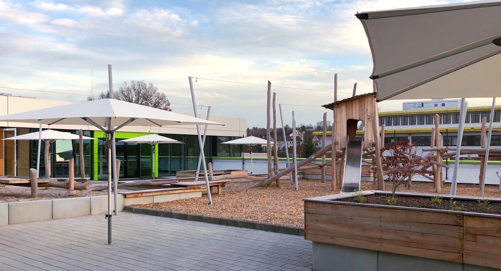 Die viergruppige Kita gruppiert sich um den Dachspielbereich. Ein Mittelgang trennt die Zonen für Klein- und Vorschulkinder, sodass altersgerechte Angebote möglich sind.