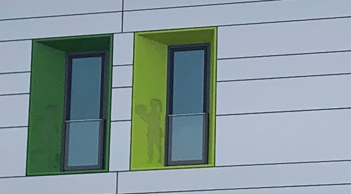 Die Fassade vermittelt zwischen den beiden Nutzungen: Im Erdgeschoss angepasst an das CI des Markts, im Obergeschoss spielerisch interpretiert. Perforationen mit kindlichen Motiven lassen die Nutzung sichtbar werden – abends leuchten die hinterlegten Bilder nach außen.