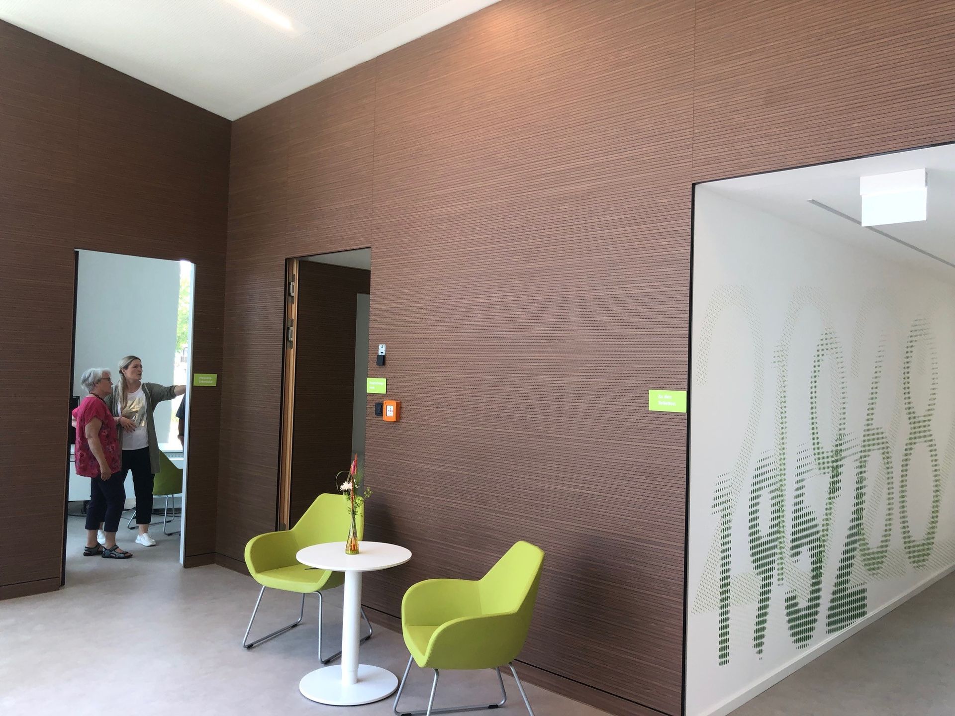 Platz. Wie ausgebreitete Arme öffnet sich der neue Baukörper zum Kirchplatz hin. Dort laden säumende Sitzgelegenheiten