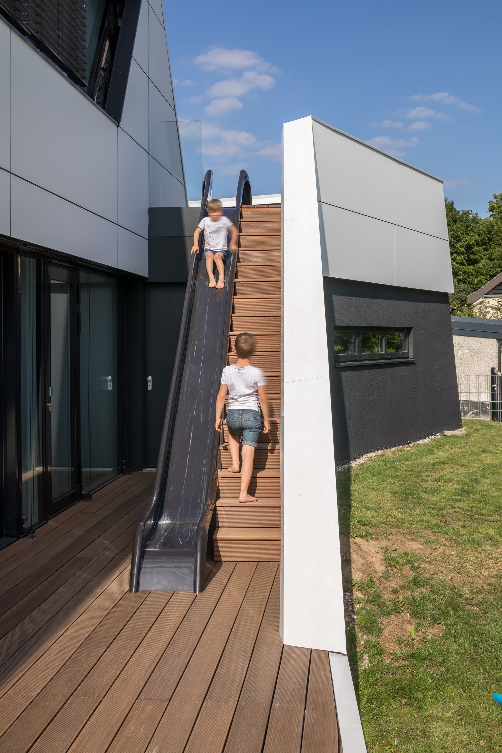 Die Grundidee: Ein klarer Baukörper, um den sich ein umlaufendes Band legt. Es löst sich stellenweise und formt Terrassen, das Eingangs-Vordach und eine integrierte Rutsche. Durch die eingeschossige Garage fügt sich das Gebäude maßstäblich in die Umgebung ein.