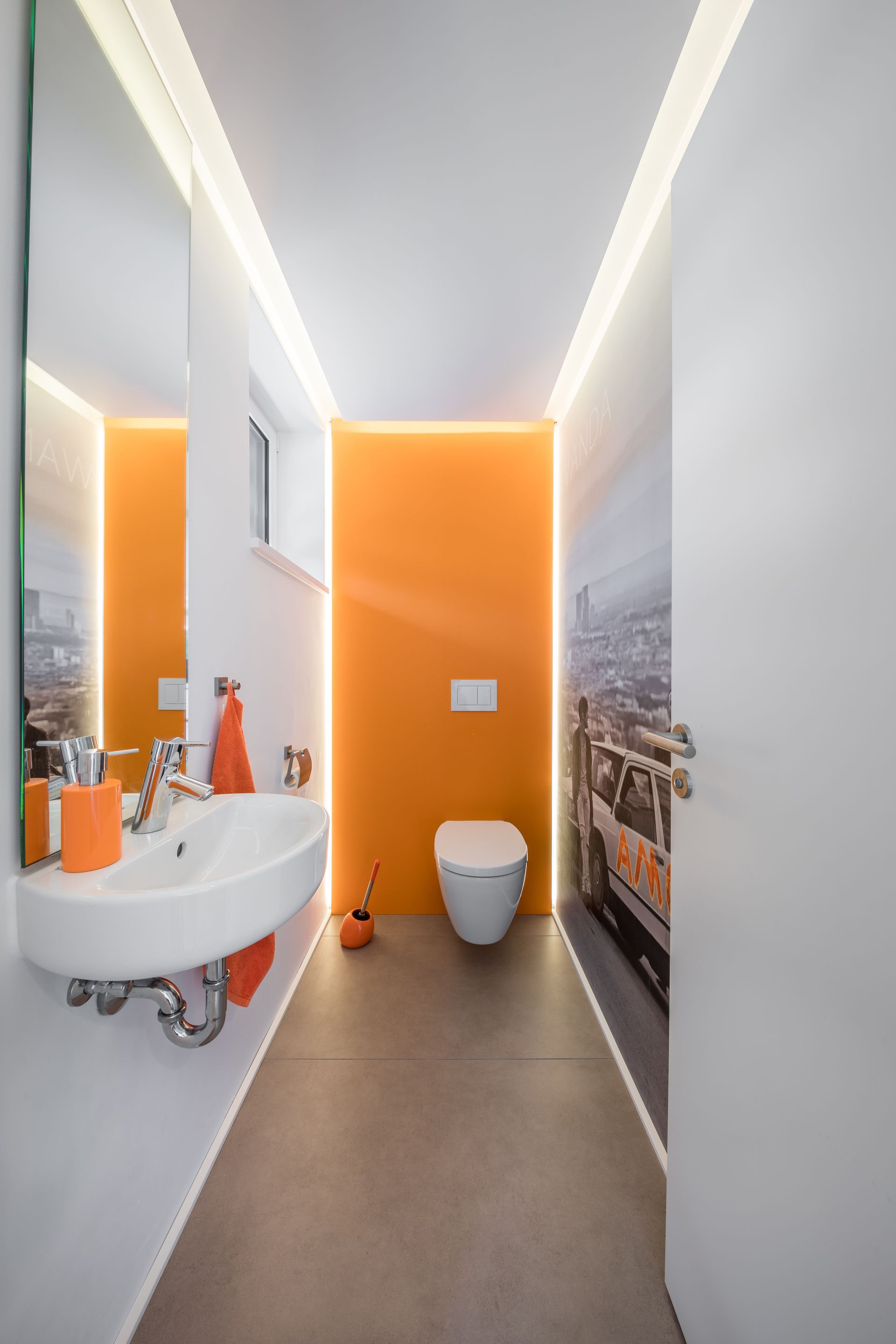 So finden sich in den Bädern orangefarbene Rückwände und grafisch bearbeitete Motive aus Filmen oder von Lieblingsbands als wiederkehrende Gestaltungselemente.
