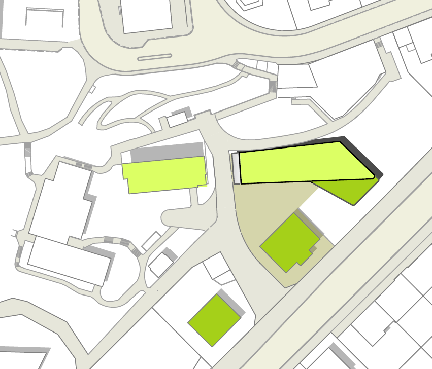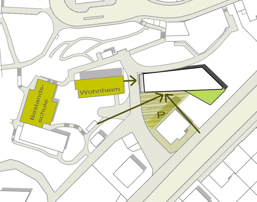 Das Gebäude greift die Breite des westlich angrenzenden Wohnheims auf und führt entlang der Bundesstraße die Körnung der südlich gelegenen Punkthäuser fort. Die Geschossigkeit orientiert sich am Bestand, staffelt sich mit dem Gelände ab und wahrt so den nötigen Abstand zu Haus 23. Auf diese Weise fügt sich die Schule selbstverständlich in den städtebaulichen Kontext ein.